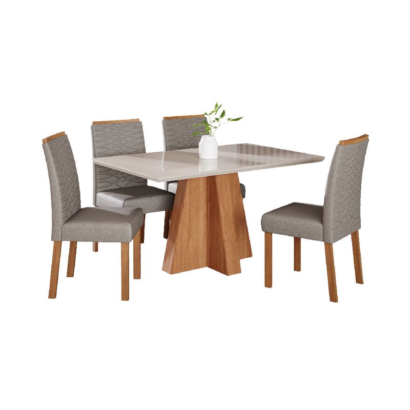 Sala de jantar Patricia de 1,30x,0,80 com 4 cadeiras Clarice. Que tal reunir a sua família para um jantar? Nesse momento a Cimol vai está presente, proporcionando situações agradáveis e descontraídas! A mesa Patricia possui uma base em formato cruz, seu tampo é em mdf/vidro com bordas chanfradas e acabamento em laca. A cadeira Clarice representa a fusão perfeita entre elegância, conforto e praticidade. Sua estrutura é habilmente confeccionada em madeira, conferindo-lhe não apenas uma base sólida e durável, mas também um toque de rusticidade refinada que complementa diversos estilos de decoração. O assento e o encosto da cadeira são revestidos com estofamento de alta qualidade, proporcionando uma experiência de conforto excepcional. A inovação da Clarice também se estende ao seu sistema de facil montagem.