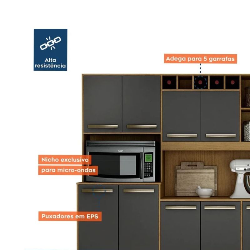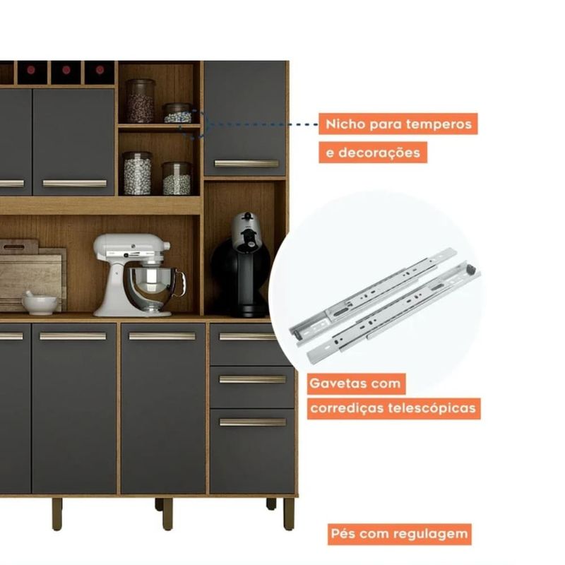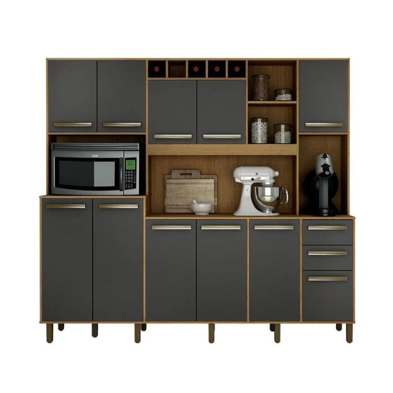 O Armário de Cozinha Completo Petra Valdemóveis é projetado para transformar sua cozinha em um ambiente funcional e de extremo bom gosto. Com seus 11 Portas e 2 Gavetas, este conjunto oferece toda a estrutura necessária para armazenar seus pertences de forma organizada. A estética é um ponto alto: a base Cinamomo traz o aconchego da madeira, enquanto o Grafite adiciona um toque industrial e contemporâneo. Este Armário de Cozinha Amplo inclui balcão (para pia ou tampo) e módulos aéreos, garantindo que você tenha um Armário Paneleiro e um espaço otimizado. Invista na Cozinha Modulada Petra e desfrute da durabilidade e do design moderno da Valdemóveis.