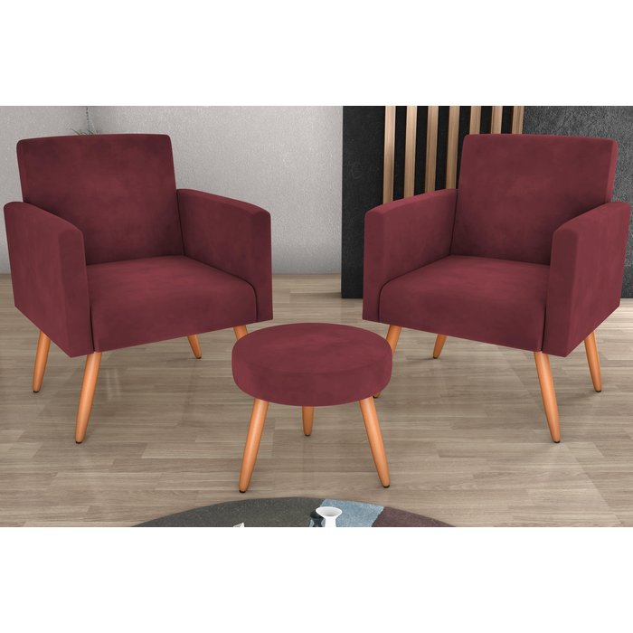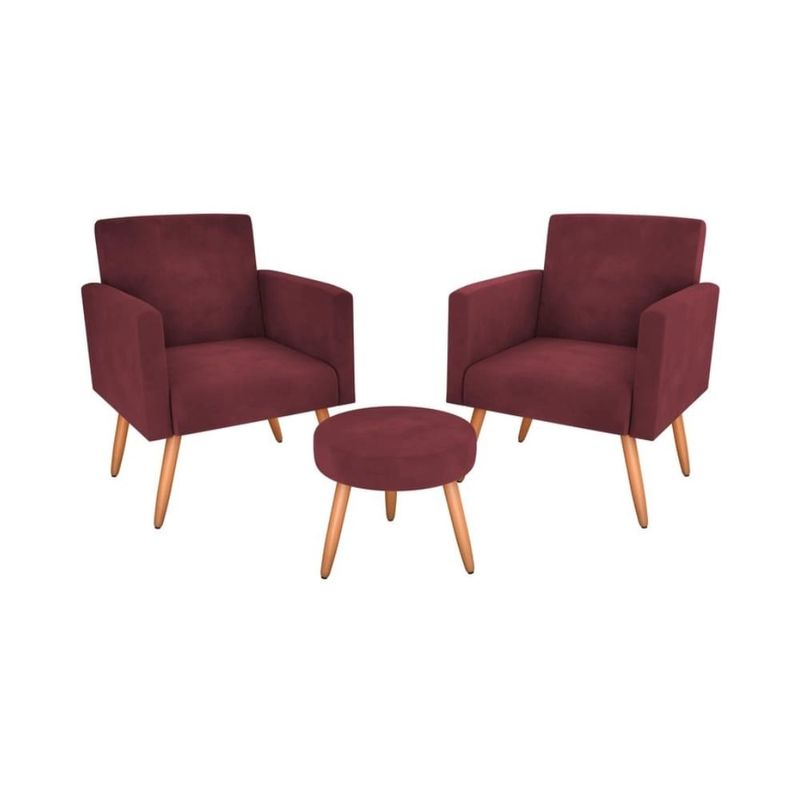 O Conjunto Dallas (2 Poltronas + 1 Puff) combina design retrô-moderno com conforto. Sua estrutura em madeira de reflorestamento e pés palito garantem estabilidade e durabilidade, enquanto o revestimento em veludo adiciona maciez e um acabamento elegante ao ambiente. O Conjunto 2 Poltronas Decorativas Dallas com Puff da Matrix é ideal para quem busca renovar a decoração com praticidade e bom gosto. O design das poltronas oferece um assento confortável e um encosto aconchegante, enquanto o puff complementa a funcionalidade, sendo perfeito para relaxar. A cor Bordô é a grande estrela, oferecendo um contraste vibrante e elegante que se destaca em ambientes de cores neutras. Fabricado com estrutura em madeira de Eucalipto, este conjunto de 3 Peças não só embeleza o ambiente, mas também garante a durabilidade. Adquira o Conjunto Dallas e leve sofisticação e conforto de alto nível para a sua sala.