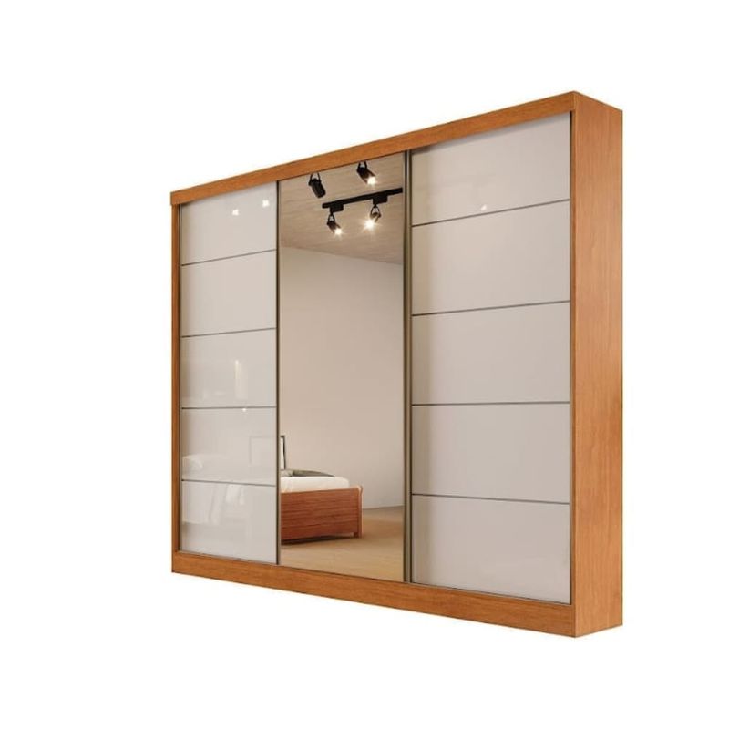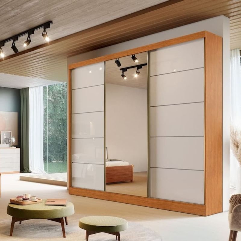 Portas: Possui 3 Portas de Correr com trilhos em alumínio, sendo a porta central equipada com um Espelho de segurança, ideal para o dia a dia.