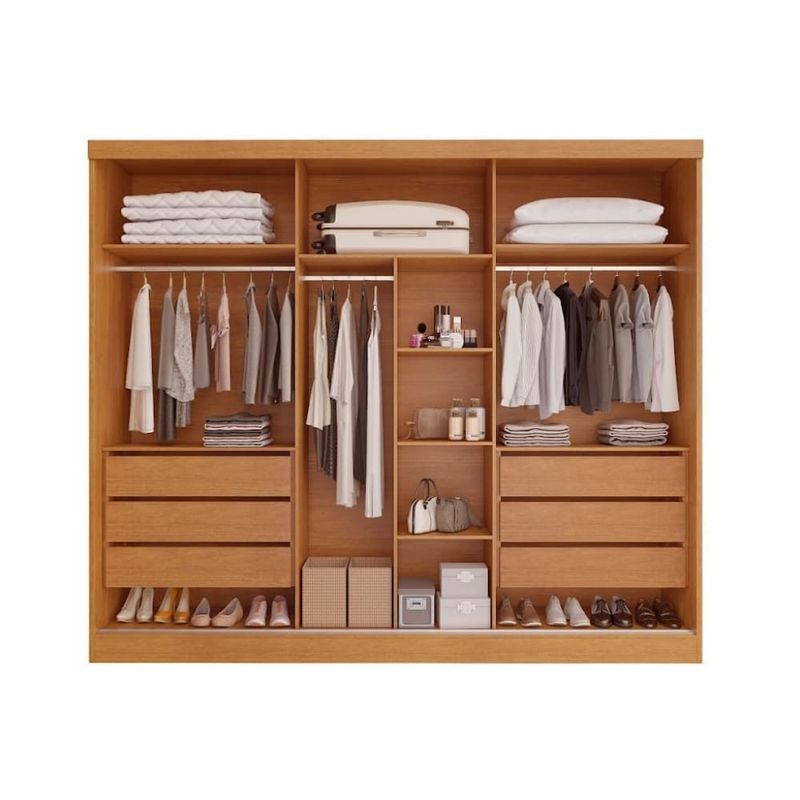 Organização Interna: Possui excelente divisão interna no sistema Ele e Ela, incluindo prateleiras centrais, Cabideiros em Alumínio para roupas longas e curtas, e espaço específico para calçados ou caixas.