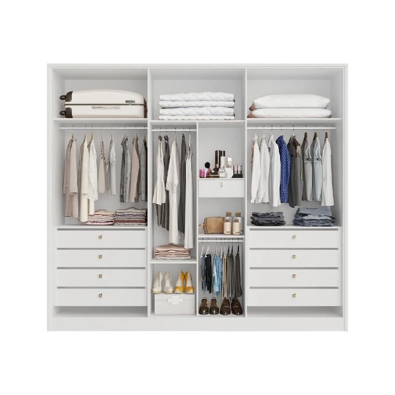 Roupeiro ideal para quem deseja unir funcionalidade e elegância no quarto. Com uma estrutura robusta, 100% produzida em MDF de 15mm, este roupeiro oferece amplo espaço interno, perfeito para organizar todos os seus pertences. O design é dividido no sistema ELE e ELA, proporcionando uma organização eficiente para ambos. Com 6 portas equipadas com puxadores de madeira, este roupeiro possui 8 gavetas internas com corrediças telescópicas e puxadores, além de uma gaveta interna estilo cofre com chave para garantir a segurança de seus itens mais valiosos. O nicho organizador conta com 3 prateleiras centrais, espaço para roupas longas e cabideiros em alumínio, oferecendo uma solução completa para suas necessidades de armazenamento. Para maior praticidade, o roupeiro inclui um espelho interno e porta-objetos fixados na porta, facilitando seu dia a dia. O fechamento lateral em chapa de 25mm assegura uma estrutura resistente e durável.