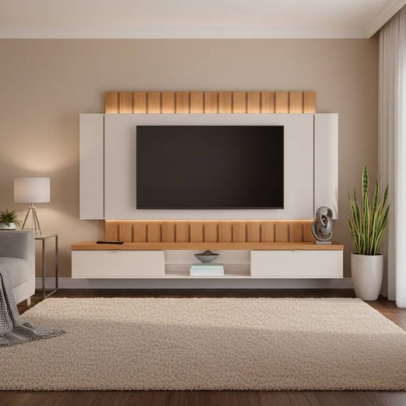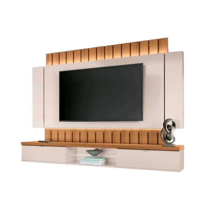 O Painel Home Suspenso Ilusion 1,80m da HB Móveis é projetado para quem busca um móvel que combine praticidade e um visual de design moderno. Seus 1,80 metros de largura garantem o suporte seguro e estável para televisores de até 55 polegadas. A principal característica é o seu Design Flutuante, que cria a ”ilusão” de mais espaço no ambiente. A combinação de cores Off White e Cinamomo é versátil, elegante e se adapta facilmente a diversos estilos de decoração. O Painel Home Suspenso Ilusion não só otimiza o espaço, mas também organiza seus aparelhos e cabos, criando um home theater clean e sofisticado.