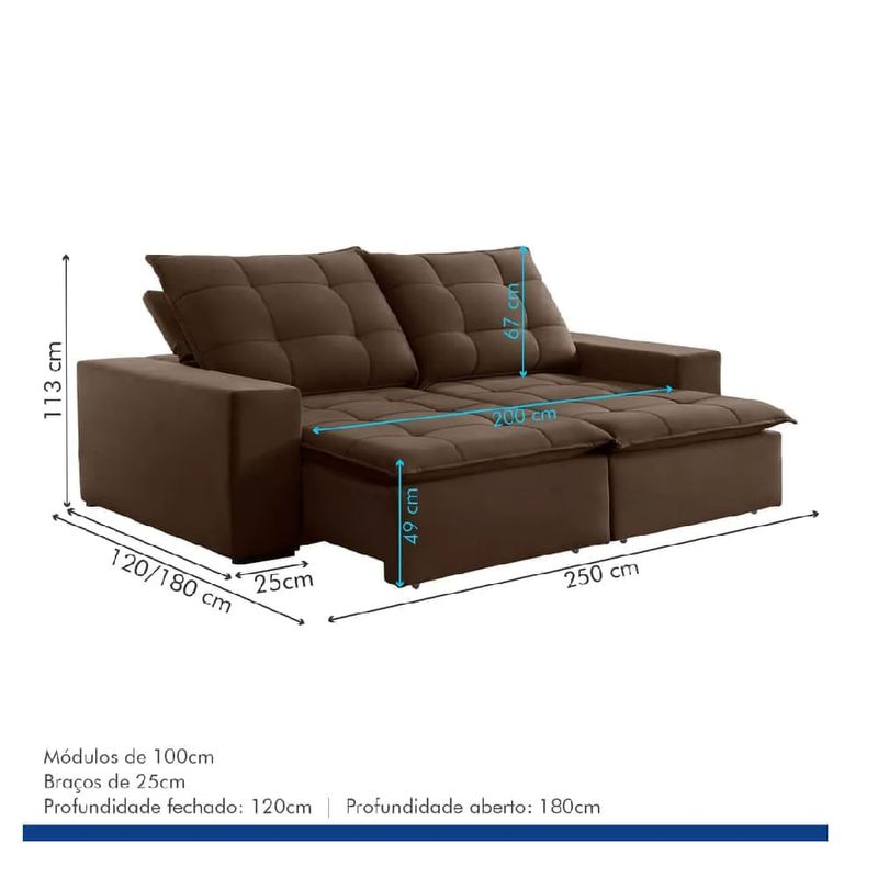 O Sofá Paris da Teixeira Estofados na cor Marrom e com 2,50m de largura é um produto de alto padrão que oferece um design moderno e um conforto notável, graças aos seus assentos com molas ensacadas, Pillow Top e encostos reclináveis. É ideal para salas amplas, proporcionando uma experiência de descanso luxuosa. O Sofá Retrátil e Reclinável Paris 2,50m da Teixeira foi meticulosamente desenhado para proporcionar o melhor descanso com um design clássico e imponente. Seus 2,50 metros de largura o classificam como um Sofá Gigante, capaz de transformar qualquer sala em um refúgio de conforto para toda a família. O assento é o grande diferencial de luxo: a sustentação firme das Molas Ensacadas é combinada com a maciez envolvente do Pillow Top, oferecendo um conforto superior e duradouro, ideal para longas horas de uso. A cor Marrom é uma escolha clássica, perfeita para criar um ambiente acolhedor, familiar e elegante. Com as funções Retrátil e Reclinável facilmente acionáveis, este sofá se adapta a qualquer necessidade. Escolha o Sofá Retrátil Grande Marrom com Pillow Top Paris e leve para sua casa o conforto premium da Teixeira.